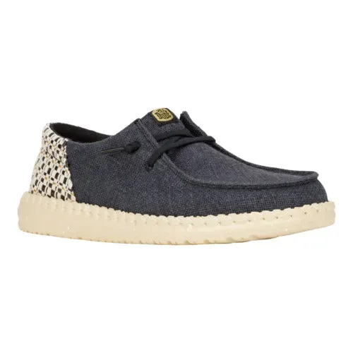- Textile upper with metallic infused woven heel